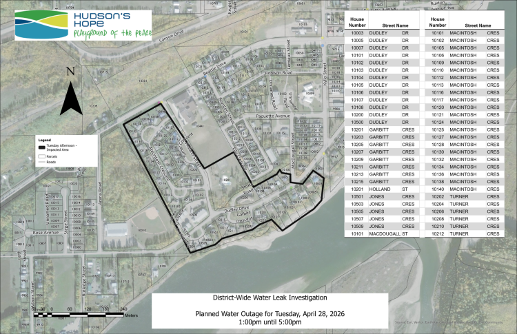 The District of Hudson’s Hope is investigating a significant leak in the town’s water system. The leak is resulting in the loss of up to 25% of the District’s treated water each day. To find the leak, District staff will need to temporarily shut off water to different parts of town. This allows staff to isolate sections of the system and narrow down where the leak is coming from. Each shutoff may last up to about four hours.